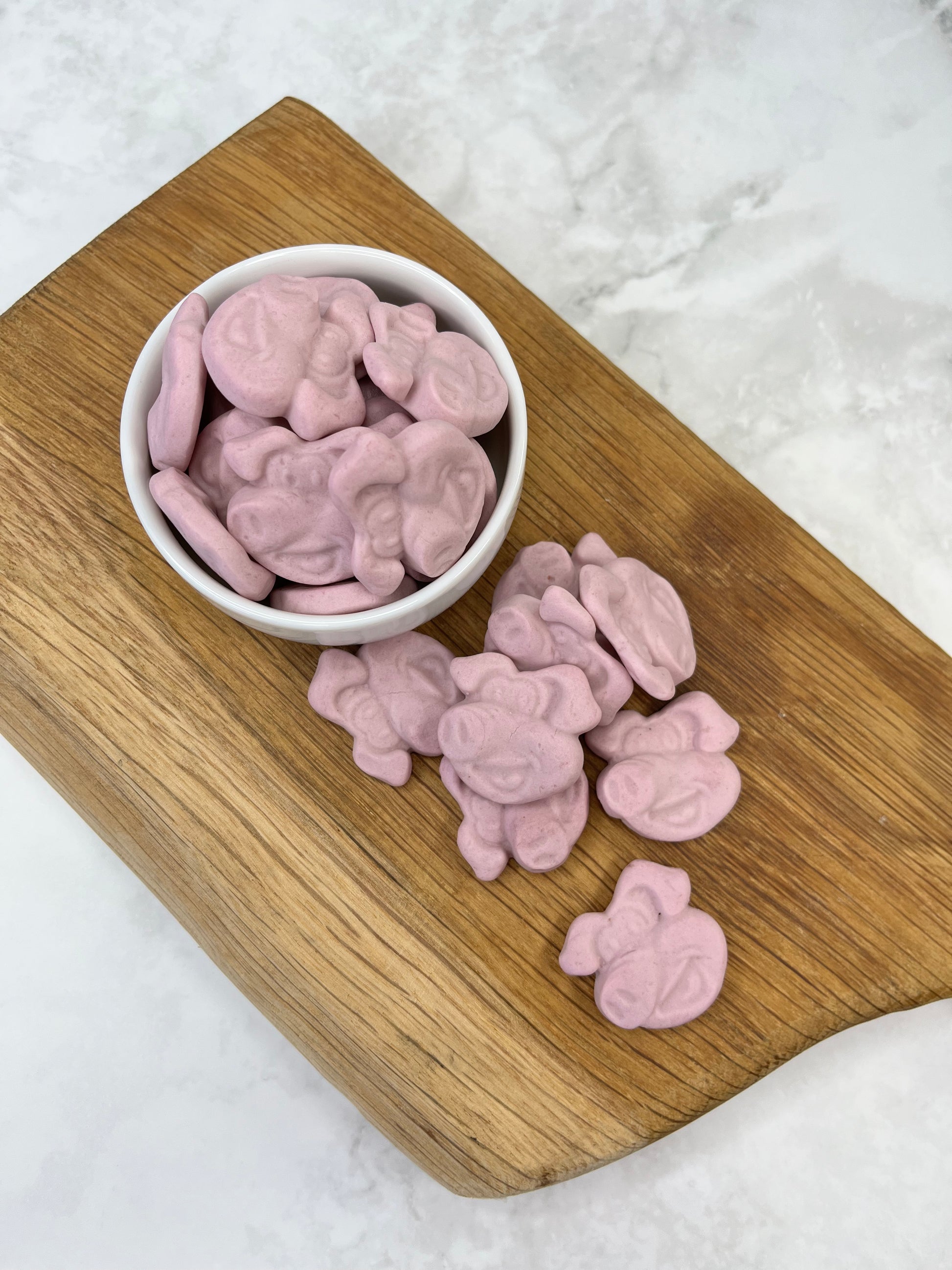 Pig's Mugs, by Swizzels', are a delicious, gluten-free raspberry-flavored foam sweet in a pig-shaped form.