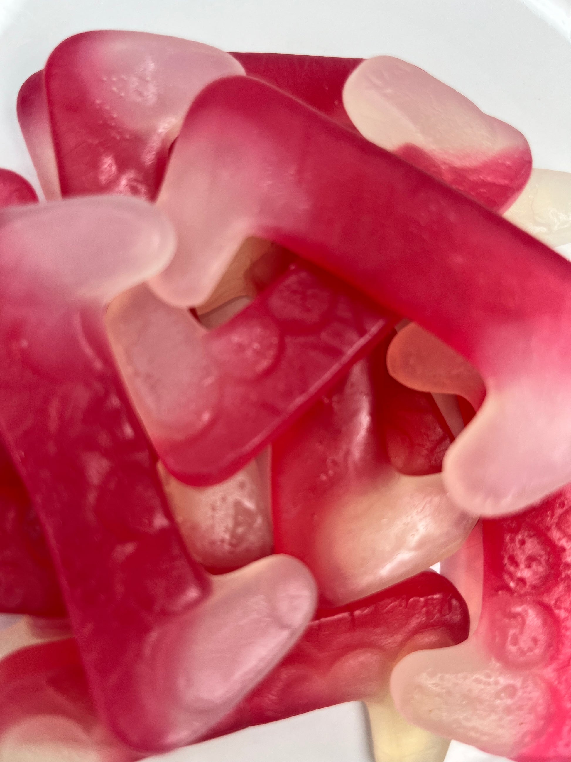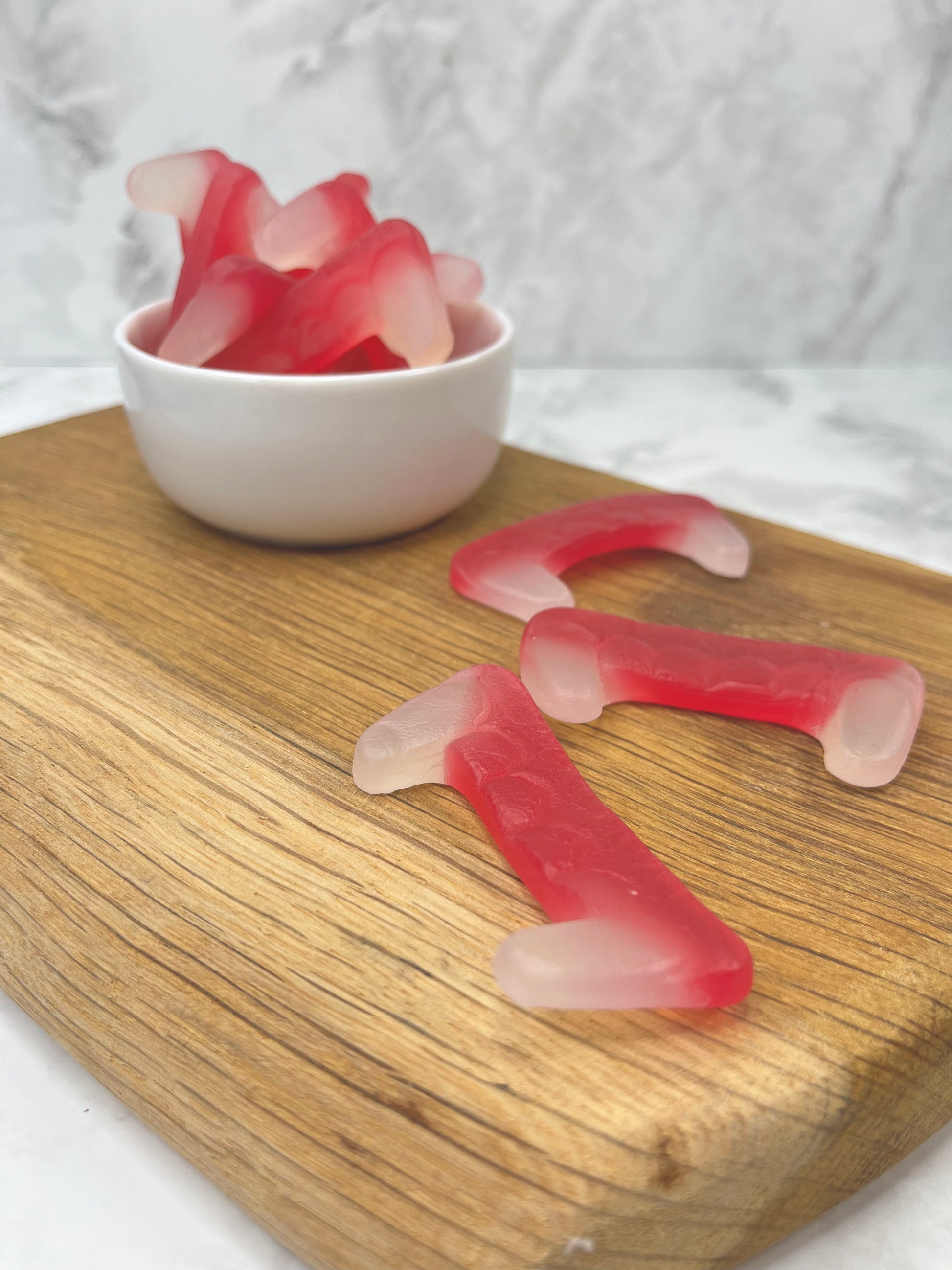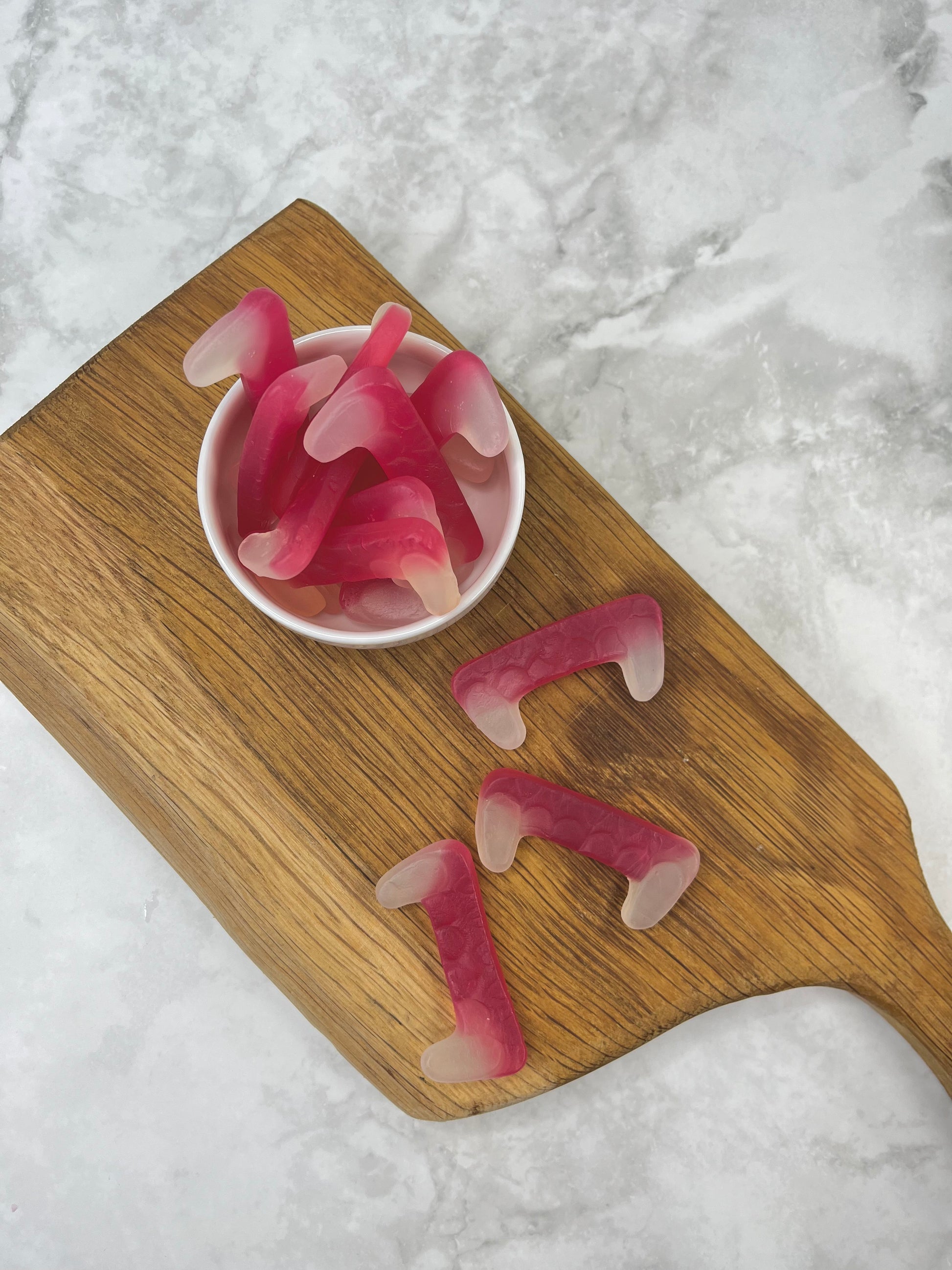 Vampire Teeth sweets. Vegan. Strawberry flavoured hard gummy sweet. Pink and white in colour. With a splash of spooky fun, these vegan treats provide a satisfyingly chewy texture and a delicious fruity flavour. So, take a bite and share a few laughs with your fellow ghouls and goblins!