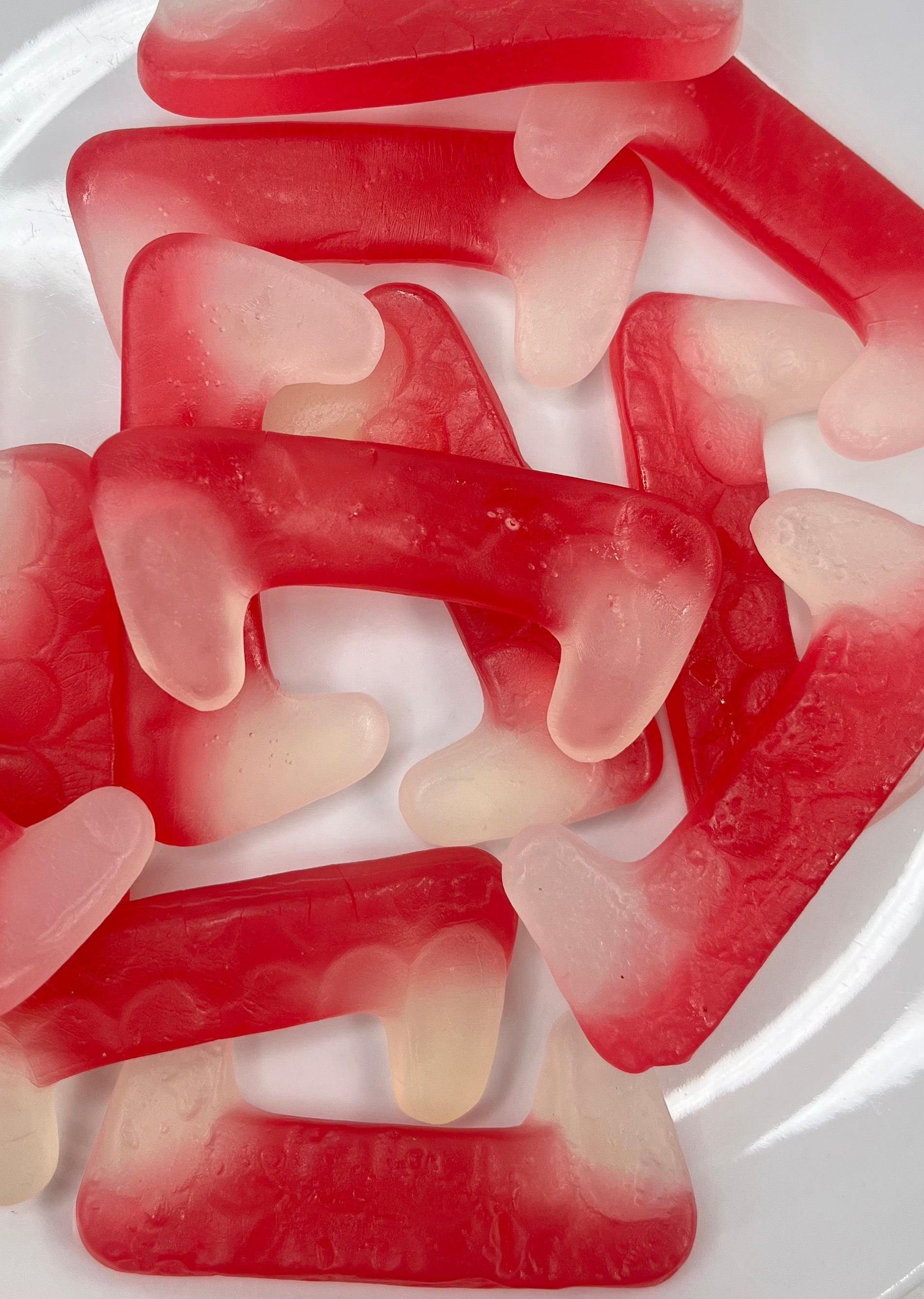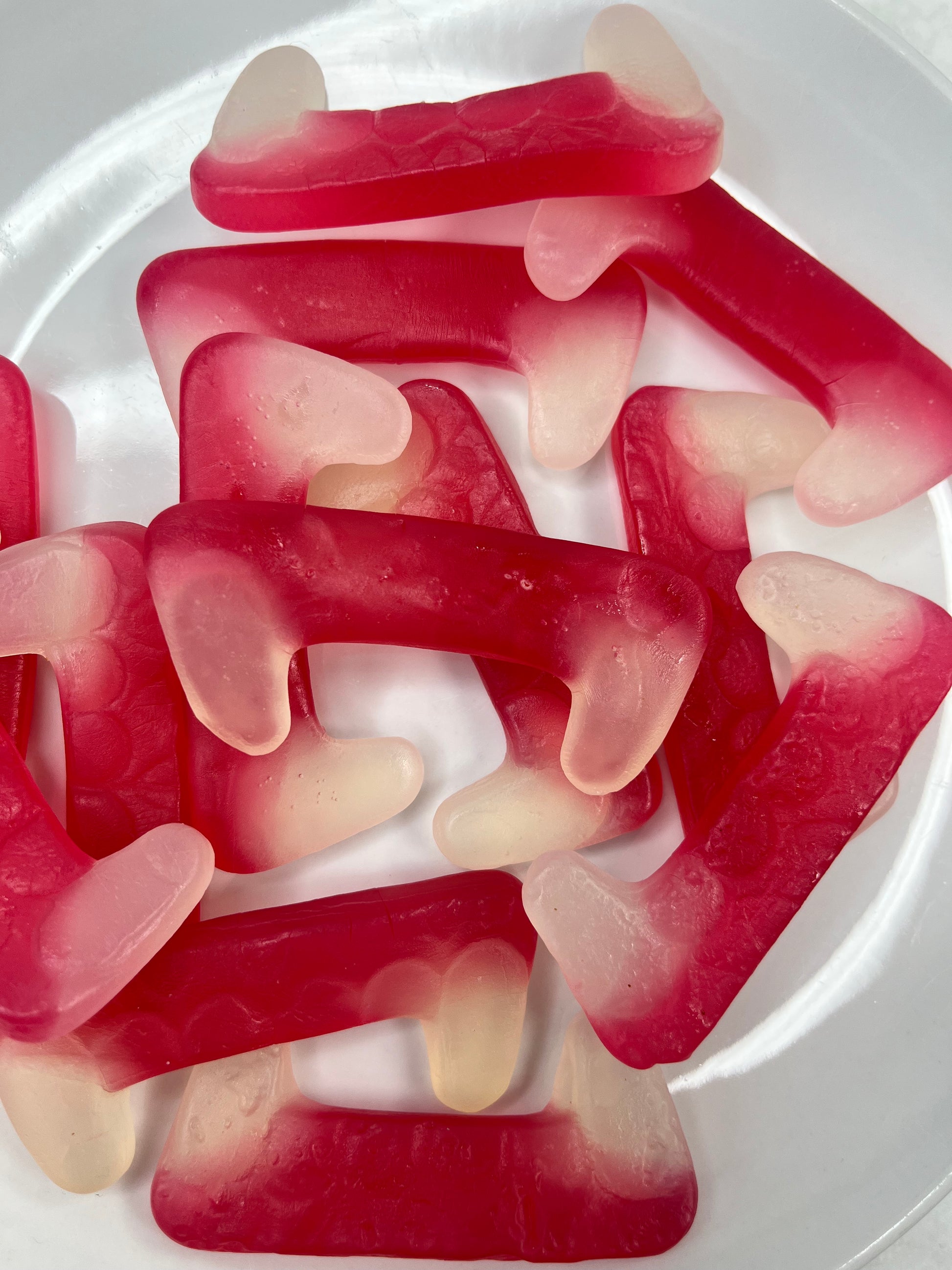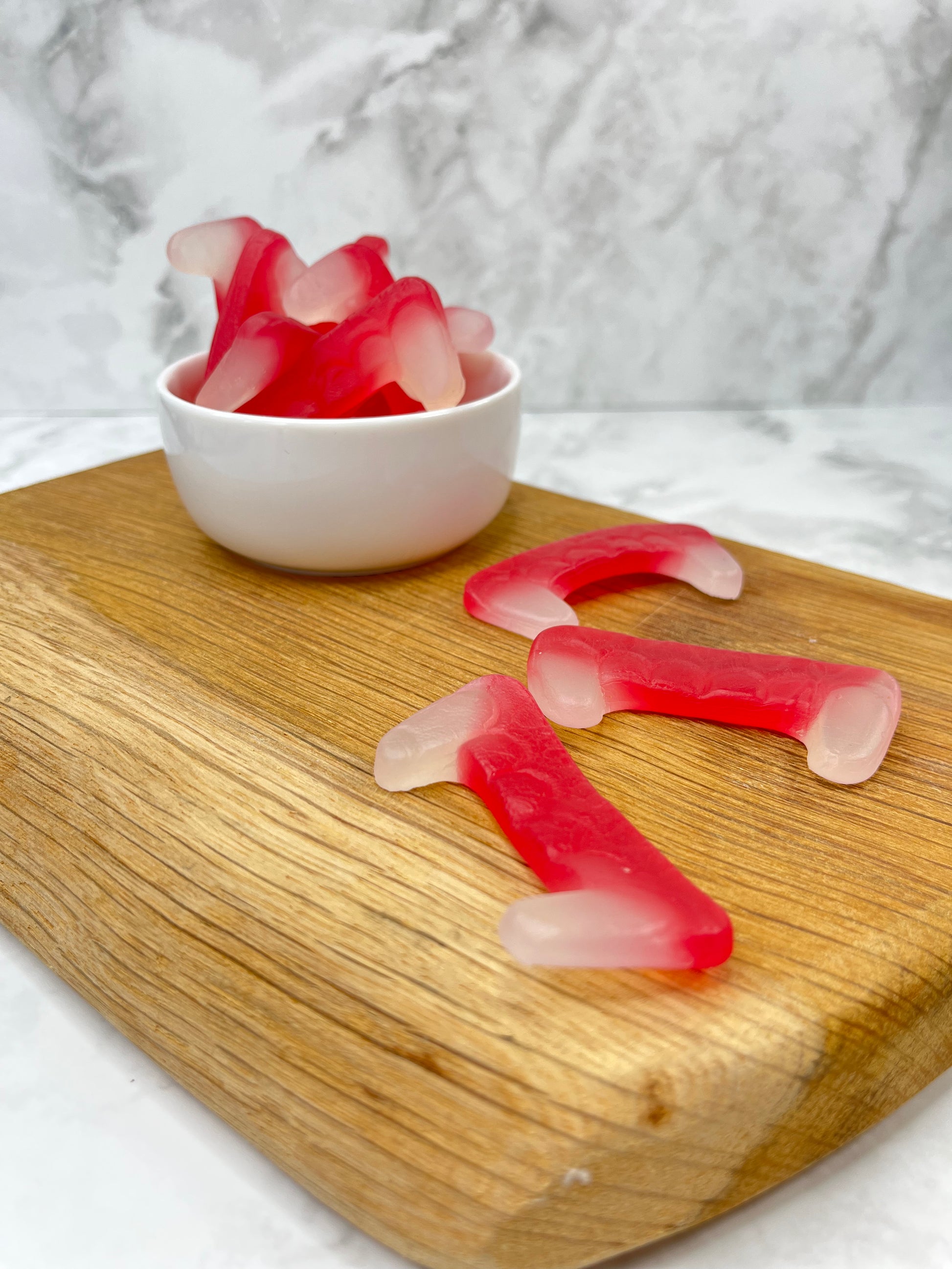 Vampire Teeth sweets. Vegan. Strawberry flavoured hard gummy sweet. Pink and white in colour. With a splash of spooky fun, these vegan treats provide a satisfyingly chewy texture and a delicious fruity flavour. So, take a bite and share a few laughs with your fellow ghouls and goblins!